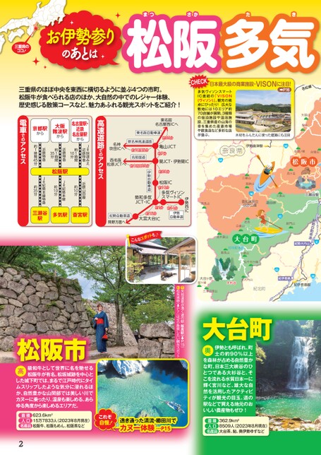 宮川貯水池経ケ峰三津河落山大河内山仙千代ケ峰小森山国見山白倉山池木屋山総門山国見山迷岳三条山高鉢山三峰山局ケ岳矢頭山高須ノ峰髯山白猪山津市名張市三重県奈良県紀北町香肌峡県立自然公園湯谷峠42226042166422369368368名松線紀伊長島駅三瀬谷駅伊勢奥津駅紀伊長島紀勢大内山紀勢自動車道大台ヶ原大杉谷松阪市大台町お伊勢参りのあとは三重県のほぼ中央を東西に横切るように並ぶ4つの市町。松阪牛が食べられる店のほか、大自然の中でのレジャー体験、歴史感じる散策コースなど、魅力あふれる観光スポットをご紹介!o天然温泉が湧く道の駅飯高駅(➡P15)m松坂城跡(➡P7)はぜひ散策したい観光スポット松阪まつさか多気たき面積人口名産品362.9km²8509人(2023年8月現在)大台茶、鮎、奥伊勢ゆずなど面積人口名産品623.6km²15万7833人(2023年8月現在)松阪牛、松阪もめん、松阪茶などこれぞ自慢!こんなスポットも♪大台町松阪市透き通った清流・櫛田川でカヌー体験…P15級和牛として世界に名を馳せる松阪牛が有名。松坂城跡を中心とした城下町では、まるで江戸時代にタイムスリップしたような気分に浸れるほか、自然豊かな山間部では美しい川でカヌーに乗ったり、温泉も楽しめる。あらゆる角度から楽しめるエリアだ。高伊勢とも呼ばれ、町土の約90%以上を森林が占める自然豊かな町。日本三大峡谷のひとつである大杉谷と、そこを流れる水質日本一に輝く宮川など、雄大な自然を活用したアクティビティが観光の目玉。道の駅などで買える地元のおいしい農産物もぜひ!奥名神吹田ICへ西名阪松原JCTへ東名阪名古屋西ICへ熊野方面へ大宮大台IC松阪IC多気ヴィソンスマートIC関JCT・伊勢関IC亀山JCT勢和多気JCT・ICIC西勢伊東名阪自動車道新名神高速道路紀勢自動車道伊勢自動車道道車動自勢伊名阪国道近鉄特急近鉄特急JR快速みえ近鉄特急近鉄山田線JR紀勢本線特急JR紀勢本線約1間時45分約10分約10分約35分京都駅から三瀬谷駅多気駅斎宮駅大阪難波駅から名古屋駅•近鉄名古屋駅から電車でのアクセス松阪駅高速道路でのアクセス約14分約1分★三重県のココ!約約1時間10分約1時間35分木材をふんだんに使った建築にも注目約1時間5分約1時間35分約35分約7分約20分約10分約15分➡P16CHECK多気ヴィソンスマートIC直結の「VISON(ヴィソン)」。観光の拠点にぴったり!広大な敷地には10エリア約70店舗が展開。3種類の宿泊施設や温浴施設、三重県産の山海の幸を集めた産直市場や飲食店など多彩な店が並ぶ。日本最大級の商業施設・VISONに注目!2