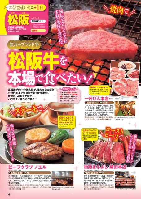 0598-51-2240P6MAP☎●まつさかまるよしかまだほんてん松阪まるよし鎌田本店松阪ま多彩な肉料理が食べられる、精肉店の直営店。焼き時間と中心温度にこだわった自家製ローストビーフは、単品以外に丼2310円(数量限定)もある。K松阪市鎌田町239-2kJR・近鉄松阪駅から徒歩10分J11時~20時30分LOi水曜p50台(変更の場合あり)0598-26-4457P15E1MAP☎●いっしょうびんほんてん一升びん本店リーズナブルな価格の秘密は、独自ルートによる一頭買いだから。オリジナルの味噌ダレが松阪牛の味わいを引き立てる。定番人気の焼肉セットのほか、松阪牛A-5セット6600円も。K松阪市南町232-3kJR・近鉄松阪駅から徒歩15分J11~21時i無休p80台0598-26-6410P6MAP☎●びーふくらぶのえるビーフクラブノエル丸幸精肉店(→P5)直営のステーキハウスで、確かな目利きで松阪牛を選び抜く。根強い人気を誇る松阪牛気まぐれステーキランチは、日によりロース、ヒレ、モモのいずれかが登場。K松阪市京町25kJR・近鉄松阪駅から徒歩7分J11時30分~13時30分LO(土・日曜、祝日は~14時LO)、17~20時LOi木曜、第1・3水曜p10台o座敷席もあるので、グループにもおすすめo1階の精肉店は9~18時の営業o明るい店内。カウンター席とテーブル席があるn炭火で焼き上げることでジューシーに伊勢神宮(内宮)松阪駅国道23号経由で約30㎞/約40分★アクセス伊勢市駅~松阪駅間は近鉄急行で約15分で到着。鉄道もおすすめ。松阪牛を本場で食べたい!肉のプロが厳選!丁寧に焼き上げるステーキ秘伝のタレにくぐらせ多彩な部位を食べ比べ噛めば旨味がジワリ!しっとり柔らかな逸品お伊勢まいりに1+日松阪まつさか高級黒毛和牛の代名詞で、柔らかな肉質と甘みのある上質な脂が特徴の松阪牛。焼肉からコロッケまで、バラエティ豊かにご紹介!100g5000円~松阪牛気まぐれステーキランチライス、サラダ、スープ、ドリンク付き。4400円焼肉セット松阪牛カルビ、塩タン、ハラミ、松阪牛ホルモンの4種。注文は2セットより。1980円松阪牛ローストビーフ絶妙な火入れ加減。精肉店で持帰り用(冷凍)も販売。憧れのブランド牛焼肉でローストビーフでステーキで松阪牛って?三重県の松阪エリア周辺で長期肥育される黒毛和種で、未経産の雌牛のみが松阪牛に認定される。脂は甘く、くどくない。4