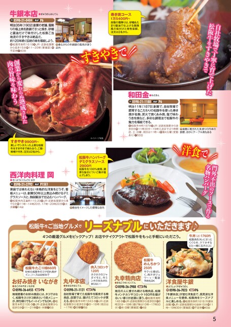 松阪牛をご当地グルメでo座敷に配された朱塗りの円卓の部屋、ほかにテーブル席もある0598-21-2792P15E1MAP☎●せいようにくりょうりおか西洋肉料理岡家庭では味わえない本格的な洋食をどうぞ。看板メニューは、創業50年以上煮込み続けるデミグラスソースと、独自製法で仕込むハンバーグ。K松阪市内五曲町115-20kJR・近鉄松阪駅から車で5分J11時~14時20分、17時~20時20分i火・水曜p14台o教会をイメージした優雅な店内門外不出のソースで作る名物ハンバーグリーズナブルいただきます♪に4つの厳選グルメをピックアップ!お店やテイクアウトで松阪牛をもっと手軽にいただこう。0598-26-6455P6MAP☎●おこのみやきいながきお好み焼きいながき地域密着のお好み焼店には、タコではなく、松阪牛入りタコ焼きという珍メニューが。持ち帰りでもイートインでもOK。K松阪市本町2106-5kJR・近鉄松阪駅から徒歩5分J11~21時i水・木曜p6台0598-26-2988P6MAP☎●まるこうせいにくてん丸幸精肉店地元の人に愛され続ける精肉店。松阪牛メンチカツやコロッケ160円を揚げるいい香りが店頭に漂う。K松阪市湊町148-9kJR・近鉄松阪駅から徒歩8分J8時30分~18時(揚げ物は10時~17時50分)i水・日曜(要確認)p4台2900円松阪牛ハンバーグデミグラスソース松阪牛を100%使用。濃厚な旨さについご飯が進んでしまう。松阪牛めんちかつ250円サクッと香ばしく、肉汁がジュワ~ッ!電話予約もOK0598-21-1121P6MAP☎●まるなかほんてん丸中本店自社牧場で育てた松阪牛を販売する精肉店。店頭では、揚げたてコロッケが買える。K松阪市中町1843-6kJR・近鉄松阪駅から徒歩6分J8~18時(祝日は~17時)i日曜p8台肉入コロッケ120円ホクホクのジャガイモと、牛ミンチの甘みがたまらない!洋食でo昔ながらの牛鍋屋の風情が漂う店内0598-21-0404P6MAP☎●ぎゅうぎんほんてん牛銀本店明治35年(1902)創業の老舗。霜降りの極上肉を鉄鍋でさっと焼き、砂糖と醤油だけで味付けした松阪ご当地流のすきやきは絶品だ。約120年続く伝統の味を堪能しよう。K松阪市魚町1618kJR・近鉄松阪駅から徒歩15分J11~20時(要確認)i不定休p40台すきやき9900円~美しいサシが入った上質な松阪牛をすきやきで味わおう。ご飯・味噌汁付き。注文は2名から。0598-21-1188P6MAP☎●わだきん和田金明治11年(1878)創業で、自社牧場で肥育するこだわりの松阪牛を使った寿き焼が名物。炭火で焼くあみ焼、塩で味わう志を焼など、多彩な調理法で松阪牛の魅力を堪能できる。K松阪市中町1878kJR・近鉄松阪駅から徒歩8分J11時30分~19時入店まで(21時閉店、土・日曜、祝日は11時~)i第4火曜(変動あり)p50台寿き焼コース1万5400円~自慢の霜降りは、砂糖&たまり醤油で仕上げる関西風の味付けと相性抜群。注文は2名から。すきやきで創業から変わらぬ熟成された肉の旨味を味わう自社牧場で丁寧に育て上げた松阪牛をすきやきで0598-26-7023P6MAP☎●ようしょくやぎゅうぎん洋食屋牛銀「牛銀本店」が営む洋食店で、庶民派な洋食メニューを提供。松阪肉をリーズナブルに楽しめる。K松阪市魚町1618(牛銀本店隣)kJR・近鉄松阪駅から徒歩15分J11時~19時30分(要確認)i不定休p40台牛丼(上)1760円松阪肉をタレにさっとくぐらせ、タマネギなどと一緒に玉子とじに松阪牛たこ10個660円炒めた松阪牛のコマ切れ肉がイン。ソースはお好みで※イメージ写真5