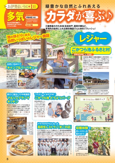 緑豊かな自然とふれあえる0598-67-6196P15E2MAP☎●ごかつらいけふるさとむらごかつら池ふるさと村五桂池に隣接する複合施設が、2023年4月にリニューアルオープン。ご当地グルメが味わえる「マルシェグランマキッチン」が新設され、キャンプや収穫体験など従来のレジャーに加えて楽しみが倍増!K多気町五桂956k伊勢道・紀勢道勢和多気ICから車で10分G入場無料Ji施設により異なるp400台伊勢神宮(内宮)元丈の館伊勢自動車道経由で約33km/約35分★アクセス古くから交通の要衝で、伊勢神宮から車で30分とアクセスに便利。お伊勢まいりに1+日多気たきm御膳や定食などメニューは3種あり各1600円l時間はなんと無制限。心ゆくまで楽しもうレジャーごかつら池どうぶつパークファミリーにおすすめ♪2024年6月リニューアル!オオサンショウウオや、県内ではここだけのアルパカ、ベネットワラビーは必見。エサやり体験も人気。G入園900円J10時〜16時30分(入園は〜16時)i火曜マルシェグランマキッチン新たに誕生した中核施設多気町の特産品でヤマノイモの王様ともいわれる「伊勢芋」を使った窯焼きピザや、とろろごはんはぜひ味わいたい一品。ほかにも松阪牛コロッケから伊勢うどんまで、三重グルメが勢揃い!J11〜16時i火曜収穫体験甘いミカンを味わおう!でミカン狩りは食べ放題とおみやげ付きで大人1200円、3歳以上の子ども1000円。期間は10月上旬〜11月末日。ジューシーな摘みたてミカンで旬の味覚を堪能しよう。高校生レストラン「まごの店」ドラマのモデルになったドラマ『高校生レストラン』の舞台がここ。相可高校食物調理科の生徒が調理から運営まですべてをこなす人気スポットだ。開店前から並ぶことも多いので、早めの訪問を!J10時30分〜売切れ次第終了(予約不可)i月〜金曜(祝日の場合は営業。営業日は相可高校HPで要確認)池のほとりにある自然いっぱいのレジャー施設カラダが喜ぶ♪o新しく建て替えられた食堂&管理棟mボートで五桂池をス〜イスイ♪土・日曜、祝日のみ利用可、3人乗り1500円〜n伊勢芋とろろの和風ピザ1080円、地元産の米粉で作る、たきチュロス1本280円n14時30分〜はサイドメニューとドリンクのみ注文可三重県最大のため池・五桂池や、薬草の郷など、多気町の自然にふれる複合施設で心と体をリフレッシフュ!lバーベキューは屋根付きで天気を気にせず利用できるはキャンプ&バーベキュー自然に包まれて敷地内にはロッジやキャンプサイトがあり、宿泊も可能。日帰り&手ぶらで利用できるバーベキュープランもあるので、気軽に自然を満喫できる。詳細は予約時に問合せを。om手ぶらでバーベキューはコンロ1台3000円+食材セット1人前3000円〜(写真は2人前)8