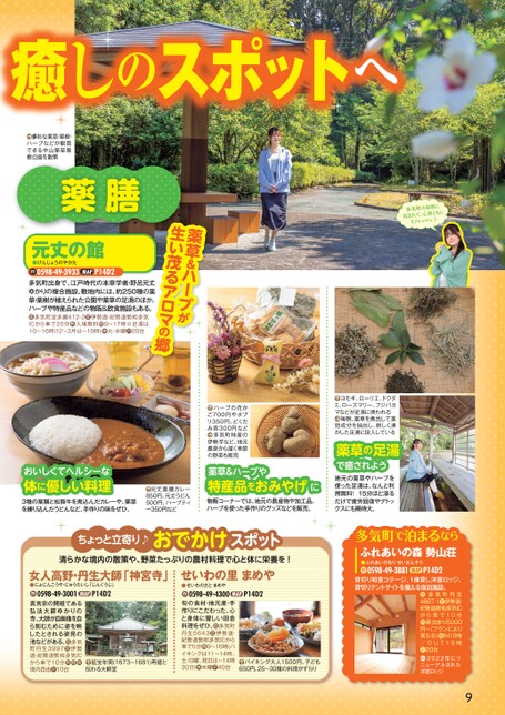 0598-49-3933P14D2MAP☎●げんじょうのやかた元丈の館多気町出身で、江戸時代の本草学者・野呂元丈ゆかりの複合施設。敷地内には、約250種の薬草・薬樹が植えられた公園や薬草の足湯のほか、ハーブや特産品などの物販&飲食施設もある。K多気町波多瀬412-2k伊勢道・紀勢道勢和多気ICから車で20分G入場無料J9〜17時※足湯は10〜16時(12〜3月は〜15時)i火・水曜p20台o元丈薬膳カレー850円、元丈うどん500円、ハーブティー350円などoヨモギ、ローリエ、ドクダミ、ローズマリー、フジバカマなどが足湯に使われるl毎朝、薬草を煮出して薬効成分を抽出し、新しく沸かした足湯に投入しているoハーブの花かご700円やポプリ350円、どくだみ茶300円などl多気町特産の伊勢芋など、地元農家から届く季節の野菜も販売薬膳体に優しい料理おいしくてヘルシーな3種の薬膳と松阪牛を煮込んだカレーや、薬草を練り込んだうどんなど、手作りの味をぜひ。特産品おみやげに薬草&ハーブや物販コーナーでは、地元の農産物や加工品、ハーブを使った手作りのグッズなどを販売。薬草の足湯で癒されよう地元の薬草やハーブを使った足湯は、なんと利用無料!15分ほど浸るだけで疲労回復やデトックスにも期待大。薬草&ハーブが生い茂るアロマの郷ちょっと立寄り♪おでかけスポット清らかな境内の散策や、野菜たっぷりの農村料理で心と体に栄養を!0598-49-3001P14D2MAP☎●にょにんこうや・にゅうたいし「じんぐうじ」女人高野・丹生大師「神宮寺」真言宗の開祖である弘法大師ゆかりの寺。大師が自画像を自ら刻むために姿を映したとされる姿見の池などがある。K多気町丹生3997k伊勢道・紀勢道勢和多気ICから車で10分GJi境内自由p10台0598-49-4300P14D2MAP☎●せいわのさとまめやせいわの里まめや旬の食材・地元産・手作りにこだわった、心と身体に優しい田舎料理をぜひ。K多気町丹生5643k伊勢道・紀勢道勢和多気ICから車で5分J9〜16時(バイキングは11〜14時、土・日曜、祝日は〜14時30分)i木曜p40台m2022年にリニューアルされた洋室ロッジo延宝年間(1673〜1681)再建と伝わる大師堂oバイキング大人1500円、子ども650円。25〜30種の料理がずらり多気町で泊まるなら0598-49-3881P14D2MAP☎●ふれあいのもりせいざんそうふれあいの森勢山荘貸切り和室コテージ、1棟貸し洋室ロッジ、貸切りテントサイトを備える宿泊施設。K多気町丹生4867-1k伊勢道・紀勢道勢和多気ICから車で10分G素泊まり5000円〜(プランにより異なる)JIN15時/OUT10時p20台l多彩な薬草・薬樹・ハーブなどが観賞できる中山薬草薬樹公園を散策癒しのスポットへ多気町の自然に包まれて、心身ともにリフレッシュ♪9