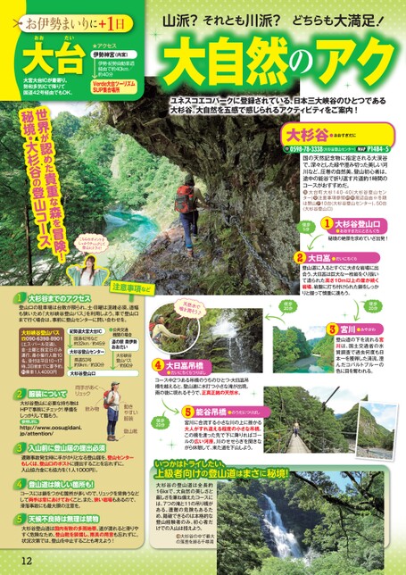 山派?それとも川派?どちらも大満足!0598-78-3338(大杉谷登山センター)P14B4〜5MAP☎●おおすぎだに大杉谷国の天然記念物に指定される大渓谷で、深々とした緑や澄み切った美しい河川など、圧巻の自然美。登山初心者は、途中の能谷で折り返す片道約1時間のコースがおすすめだ。K大台町大杉140-40(大杉谷登山センター)k注意事項参照Ji周辺自由※冬期は閉山p10台(大杉谷登山センター)、50台(大杉谷登山口)伊勢神宮(内宮)Verde大台ツーリズムSUP集合場所伊勢・紀勢自動車道経由で約40km/約40分★アクセス紀勢道大宮大台IC国道42号など約32km/約45分道の駅奥伊勢おおだい●公共交通機関の場合大杉峡谷登山バス/約90分大杉谷登山センター県道53号約9km/約30分大杉谷登山口大宮大台ICが最寄り。勢和多気ICで降りて国道42号経由でもOK。お伊勢まいりに1+日大台おおだい天然水で喉を潤そう♪世界が認めた貴重な森を冒険!秘境・大杉谷の登山コースl大杉谷の中で最大の落差を誇る千尋滝大自然のアク●おおすぎだにとざんぐち秘境の絶景を求めていざ出発!大杉谷登山口1●だいにちぐら大日嵓2登山道に入るとすぐに大きな岩場に出合う。大日嵓は巨大な一枚岩をくり抜いて造られた高さ10m以上の崖が続く岩場。岩盤に打ち付けられた鎖をしっかりと握って慎重に進もう。●みやがわ宮川3登山道の下を流れる宮川は、国土交通省の水質調査で過去何度も日本一を獲得した清流。澄んだコバルトブルーの色に目を奪われる。●だいにちぐらつりばし大日嵓吊橋4コース中2つある吊橋のうちのひとつ・大日嵓吊橋を越えると、登山道に水打つ小さな滝が出現。雨の後に現れるそうで、正真正銘の天然水。●のうだにつりばし能谷吊橋5宮川に合流する小さな川の上に掛かる大人がすれ違える程度の小さな吊橋。この橋を渡った先で下に降りればゴールの広い河原。川のせせらぎを聞きながら休憩して、来た道を下山しよう。徒歩5分徒歩20分徒歩20分徒歩20分登山口の駐車場は台数が限られ、土・日曜は混雑必須。道幅も狭いため「大杉峡谷登山バス」を利用しよう。車で登山口まで行く場合は、事前に登山センターに問い合わせを。1大杉谷までのアクセス大杉谷登山に必要な持ち物はHPで事前にチェック!準備をしっかりして臨もう。参照URLhttp://www.oosugidani.jp/attention/2服装について遭難事故発生時に手がかりとなる登山届を、登山センターもしくは、登山口のポストに提出することを忘れずに。入山協力金にも協力を(1人1000円)。3入山前に登山届の提出必須コースには鎖をつかむ箇所が多いので、リュックを背負うなどして両手は常にあけておくこと。また、狭い岩場もあるので、滑落事故にも最大限の注意を。4登山道は険しい箇所も!大杉谷登山道は国内有数の多雨地帯。道が濡れると滑りやすく危険なため、登山靴を装備し、雨具の用意も忘れずに。状況次第では、登山を中止することも考えよう!5天候不良時は無理は禁物注意事項など両手があくリュック飲み物動きやすい服装登山靴ユネスコエコパークに登録されている、日本三大峡谷のひとつである大杉谷。大自然を五感で感じられるアクティビティをご案内!大杉谷の登山道は全長約16㎞で、大自然の美しさと厳しさを兼ね備えたコースには、7つの滝と11の吊り橋がある。遭難の危険もあるため、踏破できるのは本格的な登山経験者のみ。初心者だけでの入山は控えよう。大杉峡谷登山バスt090-6398-8901(エス・パール交通)、金・土曜と指定日のみ運行、最小催行人数10名。受付は平日10〜17時。3日前までに要予約。G乗車1人4000円いつかはトライしたい、上級者向けの登山道はまさに秘境!こちらのポイントをしっかりチェックして登山にトライ!12