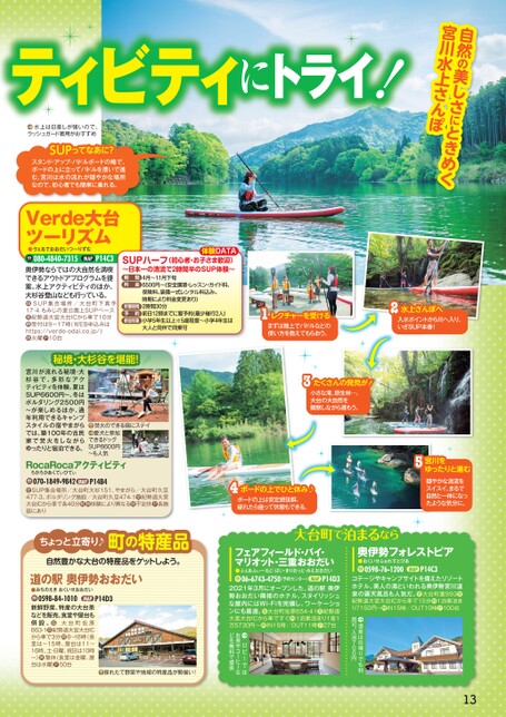 080-4840-7315P14C3MAP☎●ゔぇるでおおだいつーりずむVerde大台ツーリズム奥伊勢ならではの大自然を満喫できるアウトドアプログラムを提案。水上アクティビティのほか、大杉谷登山なども行っている。KSUP集合場所/大台町下真手17-4もみじの里公園上SUPベースk紀勢道大宮大台ICから車で10分J受付は9〜17時(WEB申込みはhttps://verde-odai.co.jp/)i火曜p10台自然の美しさにときめく宮川水上さんぽまずは陸上でパドルなどの使い方を教えてもらおう。1レクチャーを受けるちょっと立寄り♪町の特産品自然豊かな大台の特産品をゲットしよう。0598-84-1010P14D3MAP☎●みちのえきおくいせおおだい道の駅奥伊勢おおだい新鮮野菜、特産の大台茶などを販売。食堂や屋台も併設。K大台町佐原663-1k紀勢道大宮大台ICから車で3分J8〜18時(食堂は〜15時、屋台は11〜16時。土・日曜、祝日は10時〜)i無休(食堂は金曜、屋台は水曜)p50台大台町で泊まるなら期間料金所要時間予約参加対象体験DATASUPハーフ(初心者・お子さま歓迎)〜日本一の清流で2時間半のSUP体験〜4月〜11月下旬6500円〜(安全講習・レッスン・ガイド料、保険料、装備一式レンタル料込み。時期により料金変更あり)2時間30分前日12時までに要予約(最少催行2人)小学5年生以上※5歳程度〜小学4年生は大人と同伴で同乗可入水ポイントから川へ入り、いざSUP本番!2水上さんぽへ小さな滝、原生林…。大台の大自然を観察しながら進もう。3たくさんの発見が!ボードの上は安定感抜群。疲れたら座って休憩もできる。4ボードの上でひと休み♪穏やかな清流をスイスイ。まるで自然と一体になったような気分に。5宮川をゆったりと進むo採れたて野菜や地域の特産品が勢揃い!l温泉は日帰りでも利用可。入浴700円0598-76-1200P14C3MAP☎●おくいせふぉれすとぴあ奥伊勢フォレストピアコテージやキャンプサイトを備えたリゾートホテル。美人の湯といわれる奥伊勢宮川温泉の露天風呂も人気だ。K大台町薗993k紀勢道大宮大台ICから車で15分G1泊素泊まり7150円〜JIN15時/OUT10時p100台フェアフィールド・バイ・マリオット・三重おおだいlロビーではお茶やコーヒーなどを無料で提供06-6743-4750(予約センター)P14D3MAP☎●ふぇあふぃーるど・ばい・まりおっと・みえおおだい2021年3月にオープンした、道の駅奥伊勢おおだい隣接のホテル。スタイリッシュな館内にはWi-Fiを完備し、ワーケーションにも最適。K大台町佐原654-41k紀勢道大宮大台ICから車ですぐG1泊素泊まり1室1万5730円〜JIN15時/OUT11時p27台l水上は日差しが強いので、ラッシュガード着用がおすすめSUPってなあに?スタンド・アップ・パドルボードの略で、ボードの上に立ってパドルを漕いで進む。宮川は水の流れが穏やかな場所なので、初心者でも簡単に乗れる。l愛犬と参加できるドッグSUP6600円〜も人気秘境・大杉谷を堪能!070-1849-9842P14B4MAP☎ろかろかあくてぃびてぃRocaRocaアクティビティKSUP集合場所/大台町大杉151、やまがら/大台町久豆477-3、ボルダリング施設/大台町久豆474-1k紀勢道大宮大台ICから車で各40分GJ体験により異なるi不定休p各施設にありo焚火のできる宿にステイ宮川が流れる秘境・大杉谷で、多彩なアクティビティを体験。夏はSUP6600円〜、冬はボルダリング2500円〜が楽しめるほか、通年利用できるキャンプスタイルの宿やまがらでは、築100年の古民家で焚火をしながらゆったりと宿泊できる。ティビティにトライ!13